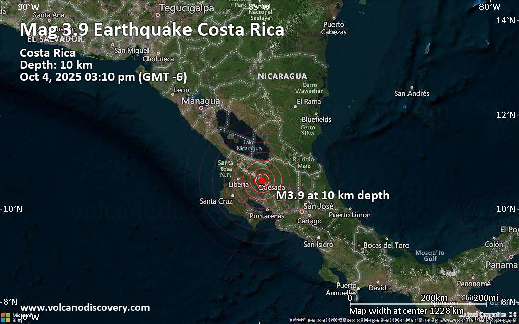 Just 23 minutes ago, a 3.9-magnitude earthquake struck near San José, Upala, Provincia de Alajuela, Costa Rica. The tremor was recorded early afternoon on Saturday, October 4th, 2025, at 3:10 pm local time, at a shallow depth of 10. km below the surface. ...Leer todo